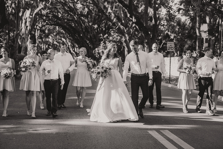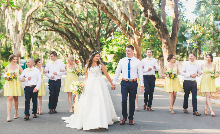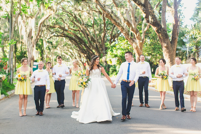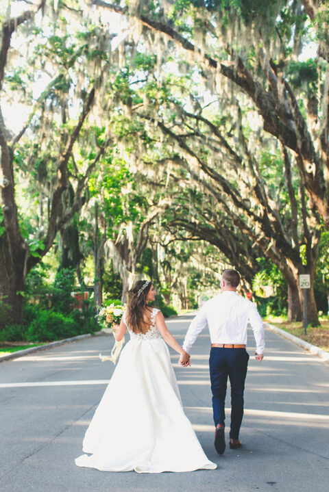 After the ceremony, Becca & Nate and the wedding party headed over to the Magnolia Street Tree Tunnel. This gorgeous street is quenticentail St. Augustine. It’s lined with Old Spanish moss trees that are picture perfect as the seeting sun inilluminates the trees.