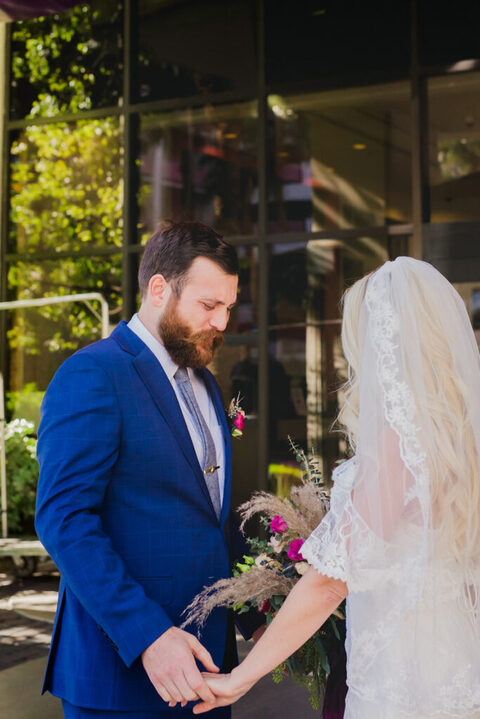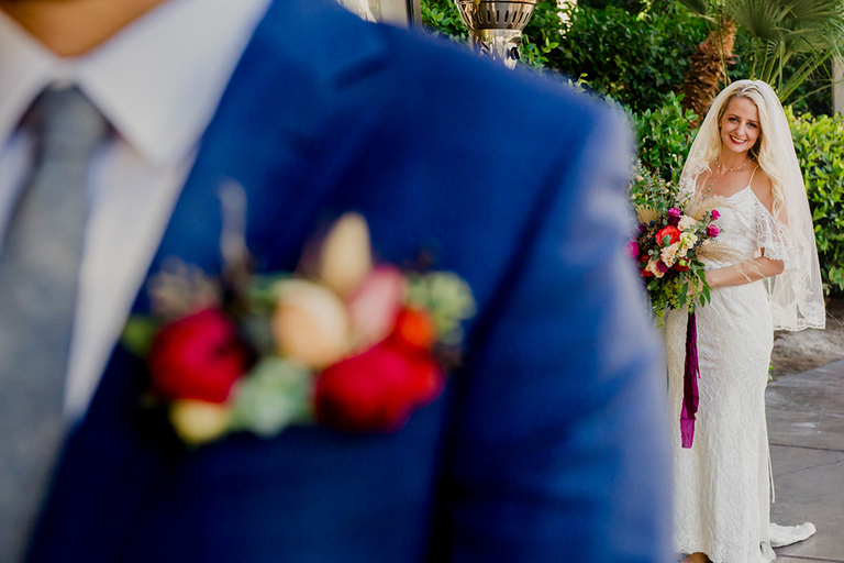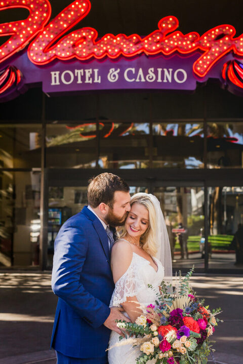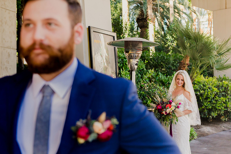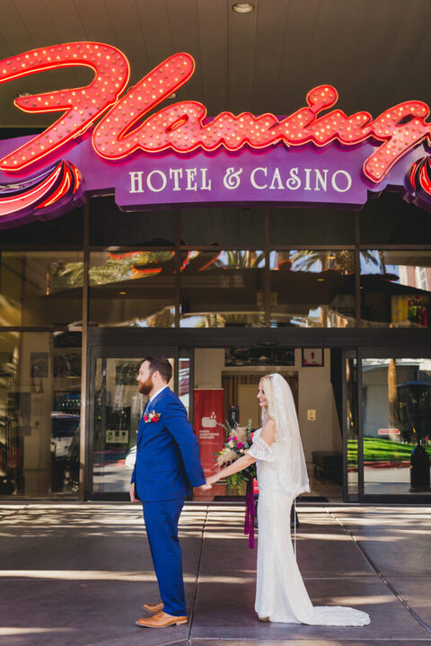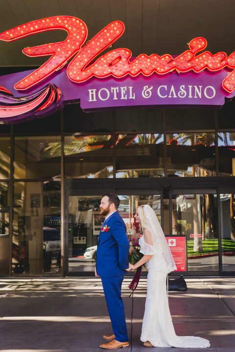 We had a HUGE event-filled day ahead of us. So we did the first look under some sparkly lights at the Flamingo Hotel, where we were staying at. I don’t even know if I was there, because it’s surreal to watch one of your best friends as a bride going to do a first look with her man. Emotional to say the least.
