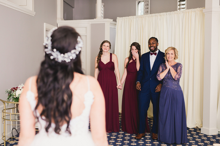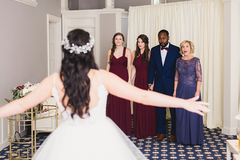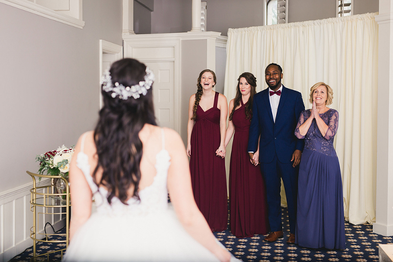Cara and her bridesmaids got ready in the classic bridal suite at the Lightner Museum. We did a fun first look with her bridesmaids after her mother helped her step into her dress. We also were able to get a really sweet first look with her father in, as well as some family portraits beforehand.